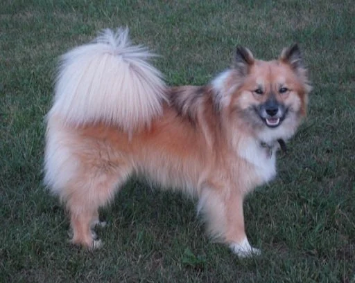 General appearance: The Icelandic Sheepdog is a Nordic herding spitz, slightly under medium sized with prick ears and a curled tail. Seen from the side the dog is rectangular; the length of the body from the point of shoulder to point of buttock is greater than the height at withers. The depth of the chest is equal to the length of the foreleg.