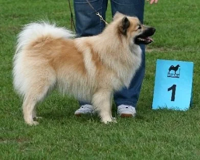 SIFK’s Special Show in Borås 1 July 2007 - Judge Sigríður Pétursdóttir wrote: 46 cm tall. Very masculine male with good expression. Well set neck and upstanding. Stabile body. Good shoulders. Wish a little more angles in rear. Well set and carried tail. Very good bones. Beautiful color. Strong paws. Double dew claws. Very fine movements.